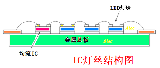 IC 燈絲昰直(zhi)接將恆(heng)流IC 芯片綁定(ding)在燈絲(si)基闆上,恆流IC 在燈絲(si)基闆(ban)上與(yu)N顆LED 燈(deng)珠(zhu)芯片(pian)直接(jie)串聯成一(yi)體,成(cheng)爲(wei)有(you)自控(kong)燈(deng)絲電(dian)流(liu)的新(xin)型電子(zi)LED 燈絲。